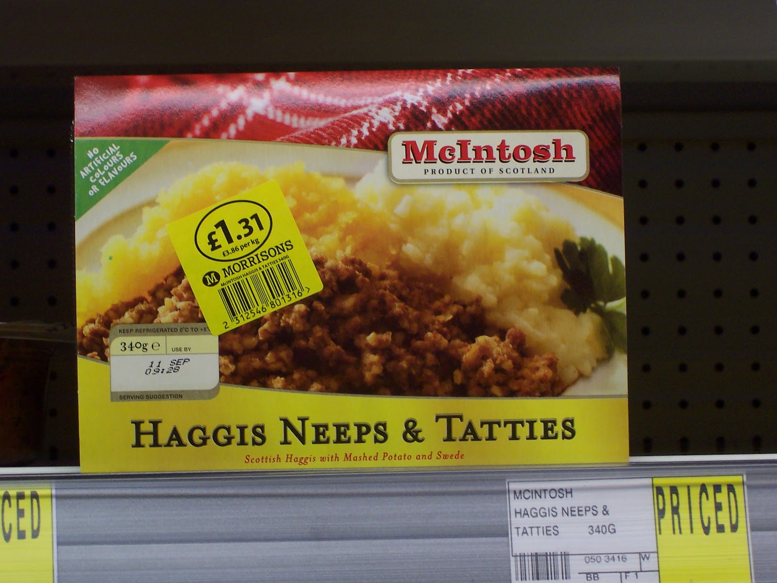 Scotland – not known for gourmet foods but certainly known for their canny marketing of offal. I had to whip out the camera when I walked into the local branch of Morrisons in Fort William and saw this box of ready made Haggis, Neeps & Tatties in the fridge. Just in case you ran out of time to make some for Burns Night. I’m a bit of a fan of Morrisons and know their chilled product range fairly well so I can attest that Haggis is not available south of the border. There is also the time that Anthony had the memorable combination of a good Scottish Whisky accompanied by a Victoria Sponge after a day hiking the foothills of Ben Nevis.