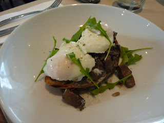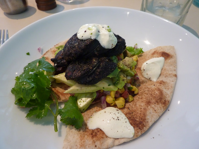 There’s a good looking menu with plenty of savoury and sweet options and I’m pleased to see that if you decide to have a lighter option such as muesli trifle or fruit salad w yoghurt, they don’t charge like a wounded bull at $7 a serve. The most expensive breakfast main is $16 and there’s plenty on offer for carnivores and vegetarians. Good to see some different breakfast options too such as the unusual pan fried black pudding, cheddar, avocado & corn salsa on tortilla ($16) that taps into the current mania for Mexican style flavours. There was no question this dish was going to be my choice. Others on the table ordered the braised mushrooms, poached eggs & marinated fetta on sourdough ($12) and, house made baked beans, ham hock, baked eggs & toast ($14).