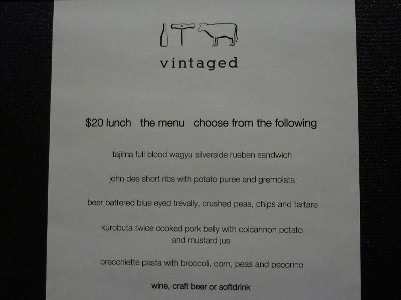 We sat at the Wine Table with a large trough running down the centre, full of ice, wine, beer and bottled water. We were there to try the lunch special of a main and wine or craft beer for $20. I selected the john dee short rib w potato puree & gremolata and the +1 had kurobuta twice cooked pork belly w colcannon potato & mustard jus. The white wine on offer was a Sirromet Sauvignon Blanc but as we had a bottle of that open in the fridge at home, we both chose a Shiraz. The room was filling quickly but the meals arrived in good time and were enormous.