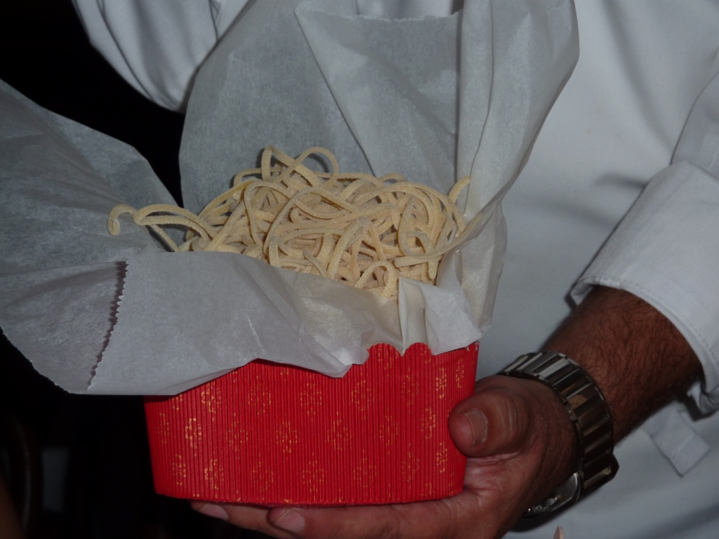 Pastas of the day were next, served on large plates to pass around. Best get in quick here as there may not be much left if you go back for seconds. On this particular evening there was gnochetti sardi ai piselli – small shell pasta w onions, pancetta, fresh peas and pecorino cheese; ravioli al pomodoro – filled w ricotta, spinach, nutmeg and served w sauce of tomato and basil and, the aforementioned linguine ai funghi. Another indication of customer focus is that we were asked if there were any special dietary requirements as the kitchen is more than happy to cater for these. Of the 12 dishes, seven dishes that were vegetarian and three were gluten free.