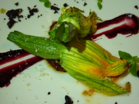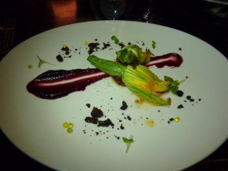 With a wine selected we peruse the menu that has 4 – 6 entrees and mains each as well as 4 vegetarian options that can be served as either. I opt for the Goat’s Curd & Ricotta Stuffed Roast Zucchini Flowers from the vegetarian menu and Anthony orders the other dish I was keen on, the antithesis of vegetarian, Braised New England Rabbit Tart. The two zucchini flowers have a small zucchini still attached and are served with the classic pairing for goat’s curd on a puree of beetroot. There’s also a scattering of dried olive and some clever olive oil caviar. The flowers are fresh and the filling is simple. It’s an enjoyable dish but not a knock out. The Rabbit Tart is served on a puree of artichoke with pistachios and is a disappointment. The taste is there with a rich gravy but the rabbit is dry and tends towards stringy. You don’t see rabbit on the menu on a regular basis so it’s a shame that this dish falls flat.