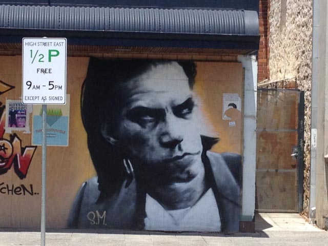 Street art - picture of musician Nic Cave spary painted onto a wall in Fremantle