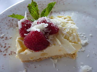 Our crumbed Camembert wedges were tasty but had been cooked on too high a heat so most of the cheese had escaped from the wedges, leaving crisp, airy triangles with no filling. The steaks were enjoyable although we weren’t asked how we would like them done – happily mine was medium. These are minor quibbles for a new restaurant and I’m sure by now, these wrinkles have been ironed out. A delicious home made white chocolate cheesecake and sticky date pudding rounded out our lazy lunch.