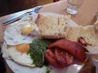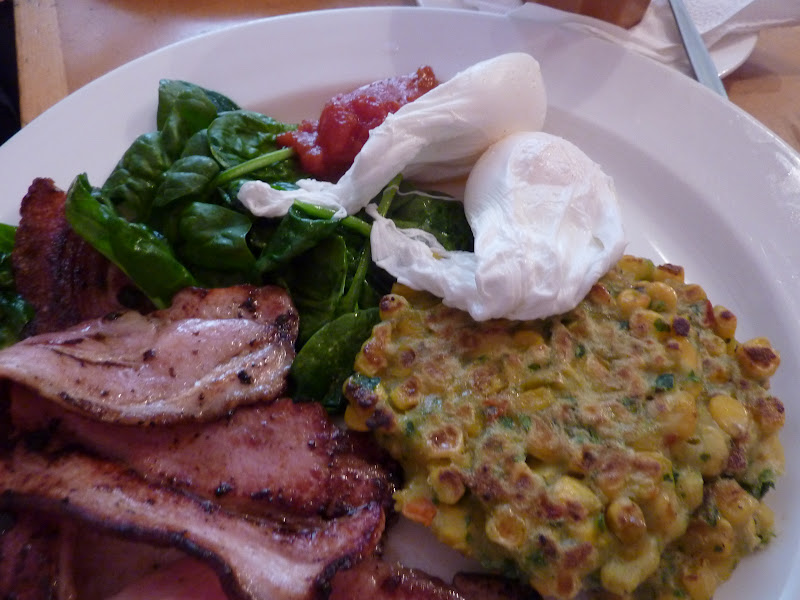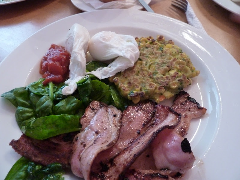 We sat inside but Martini also has a courtyard out the back and in catering for needs of their most demanding customers, a kids room and ‘chill out’ lounge upstairs. The bucket of coffee arrived quickly and was a welcome injection into a bleary morning. The breakfasts were delivered not long after and once again, Martini came up trumps. I had asked for my eggs to be poached firm and am happy to report they were delivered as ordered. I realise firm poached eggs is probably not how they should be cooked, but that’s how I like them and it’s one of my breakfast tests. Anthony said they looked like two little ghosts perched on the plate. The corn cakes didn’t thrill me. They were more like something I would turn out in my own Sunday morning kitchen. They lacked seasoning and also needed to be much crisper. What the meal lacked in crispness, it made up for in quantity and as you can see by the enormous pile of bacon on my plate, it was far too much for me. The South Sydney Eggs and the Breakfast Wrap were polished off with gusto, so clearly no complaints there.