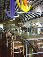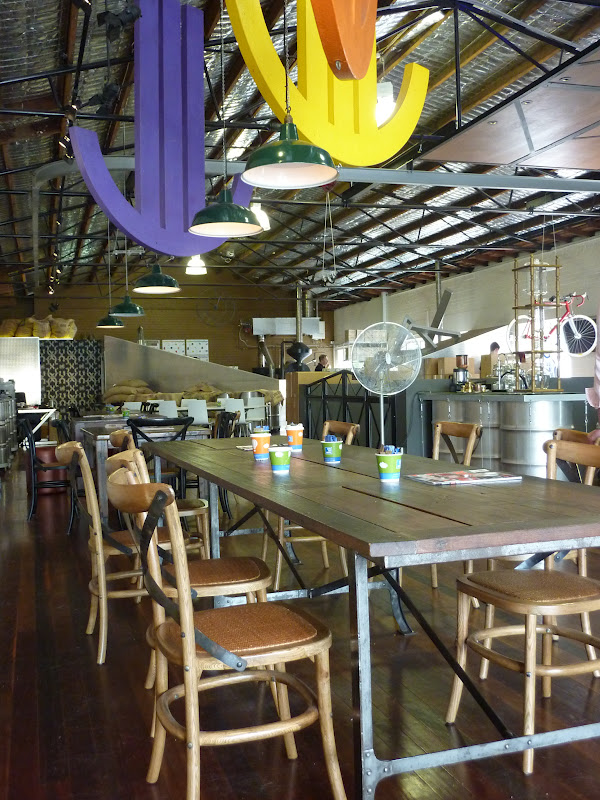Cavernous. Large communal tables and a couple of smaller ones. Funky modern art on loan from Fireworks Gallery dotted around the walls, roasting and packing at the back. Oh, and there’s a motorbike and suit of armour. The high roof with silver tar paper looks very urban chic however be warned! There’s no insulation which means it can get devilishly hot inside on a summer’s day, particularly if they are roasting coffee.