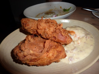 We continued to eschew wine in favour of the amazing cocktails on offer. I went for a very savoury Green Olive Spritz with Aperol, vermouth, sparkling wine, bitters, soda and enormous green olives whilst Pepsi went for a Smoked Caeser, a twist on the Bloody Mary (bloody delicious!) Our Feed dishes arrived soon after. Fried Chicken, buttermilk biscuit, low country sausage gravy ($28) was a standout – hot, crisp and juicy and the buttermilk biscuits and gravy were better than anything I’d tried in the States given that almost everything in the USA is out of a packet, ‘just add water’. Will be ordering this again next time.