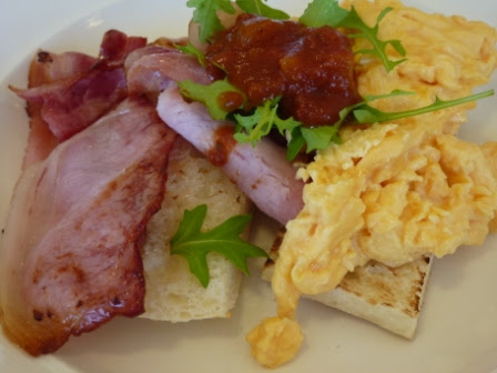 Another breakfast saw me ordering a doorstep sized croque monsieur w smoked ham gruyere cheese creme fraiche and bechamel sauce ($18.50).  It seemed pricey for what is essentially a ham and cheese toasted sandwich and as it turned out, it was a lot to pay.  There was absolutely nothing special about this dish of browned cheesy sauce on a slab of toasted Turkish.  The scrambled eggs bacon toasted turkish tomato chutney ($15.50) was basic and nothing special.