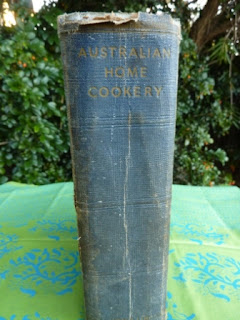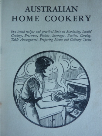Australian Home Cookery is a sizable volume of the type you might have bought from a door to door salesman or as part of an annual subscription from a book club. It has cloth bound board covers with the image of a happy housewife pulling a roast from the oven, imprinted into the front. There are no publishing details but the National Library of Australia dates it as being printed in the 1930’s.