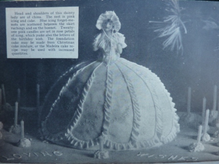 For a cookbook from the 1930’s, it seems surprisingly contemporary. There are recipes for dishes I associate with the 1960’s such as Angels on Horseback, Celery Logs and Asparagus Rolls. In the cake section, Dolly Varden makes an appearance but you are reminded straight away that this is a pre-WWII publication as the doll is made of china and not some cheap plastic model. It is suggested that Christmas Cake is just as easy as Madeira Cake for Dolly’s skirt.