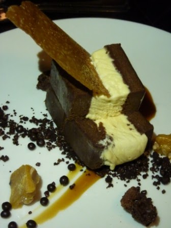 We share a pair of desserts and a cheese plate. We select a Rhubarb, Pear & Walnut Crumble served with a Blond Valrhona Sauce whilst the others go for a ‘Malt’ Brownie with Salted Caramel and Peanut Brittle. The crumble is reminiscent of something your mum or grandmother may make if they got their hands on some Valrhona chocolate. Sweet and tart fruit with a nice sandy crumble of top. Comfort food at its best. The Malt Brownie is very impressive when it comes to the table with large shards of brittle sitting atop a layered brownie. They are polished off in record time and it’s on to the cheese. I ask the waiter what cheeses are on offer and after a brief pause for consideration, he advises there’s a chevre, cheddar, brie and blue but no hint of styles or provenance. We opt for the chevre which turns out to be quite a hard style and a gooey brie served with excellent bread, fruit and muscatel accompaniments.