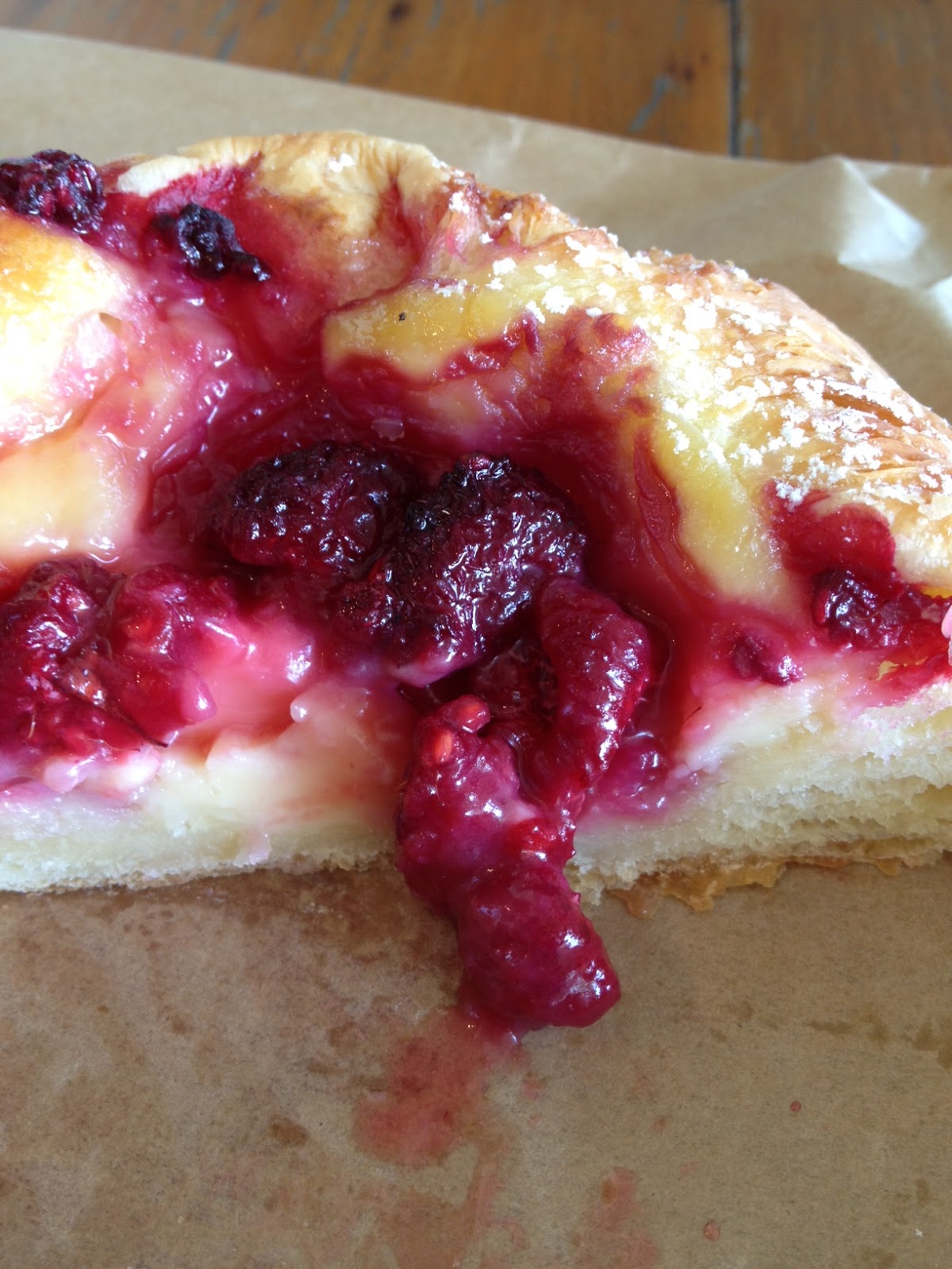 Where to begin? Because Flour & Chocolate is a bakery, there was a large range of crusty sourdough and ciabatta loaves to choose from. They were heavy for size and made a pleasing hollow sound when you tapped them on the base. But we weren’t there for the bread (though I do grab a few rolls). We were there for the sweets and, so many to choose from. I think the true test of a patisserie is the Almond Croissant – it needs to be flaky on the outside with a toothsome crunch and moist on the inside with good quality almond paste. Anthony was bedazzled by choice and the madding crowd so I selected for him – another classic, a fruit Danish. I chose raspberry and it was good to see discernible chunks of raspberry amongst the fruit sauce and custard. Both fine choices and both polished off with a coffee quick smart.