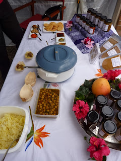 On taste at the party was a selection of chutneys, relishes such as the famous Piment Limon Vert and sauces including a Tamarind and a Chinese influenced Sweet & Sour Chiili. All items are made by hand in a commercial kitchen. Ingredients are seasonal and fresh. In the days before the tasting, I had seen photos of Ranee and her daughter (who had been pressed into service), harvesting small green mangoes from a neighbours tree.